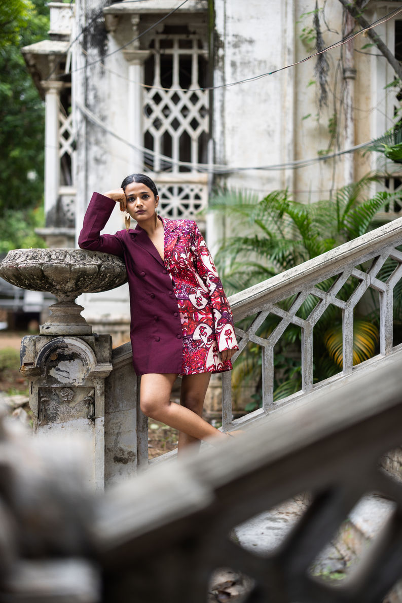 Make a statement with our bold, hald-printed and half-dyed Blazer dress. It has a structured silhouette cinched at the waist for a powerful yet chic look.