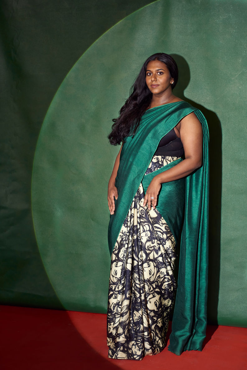 As you wrap yourself in this silky sari, the artist's bold black mural dances around your every step.